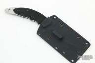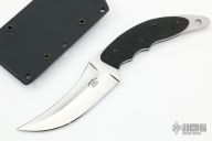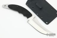 This Rhino by Bud Nealy featurse a hand rub satin finished blade with sharpened top edge, notched thumb and finger rest, .119" blade stock and 1.445" blade depth, full tang construction with black G-10 scales. Comes with a kydex sheath with magnet inside for secure storage in all directions. Excellent condition.