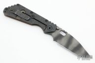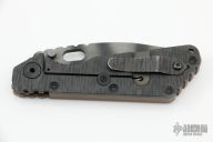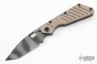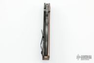 This SMF features a tiger stripe tanto blade with notched thumbrest and thumbhole. The handle has a flame finished titanium frame and front frame of tan aluminum.  Titanium clip, tip up carry. Notches on thumbrest, rear of handle, and lockup. Includes Hinderer "Lock Bar Stabilizer" for maximum reverse lock retention. Has some scuffs and scratches, otherwise good condition.