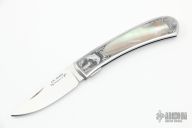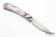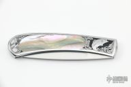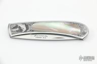 This Interframe Self Lock Folder by Scott Sawby features a hand rub satin finished blade with nail nick. The handle has stainless steel scales with abalone inlays, stainless steel backspacer. The frame has been engraved by S. Pilkington. PAT#4604803 on the inside of the backspacer. Has a couple very fine scratches, otherwise excellent condition.