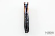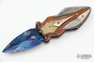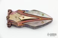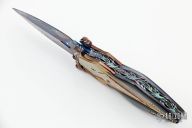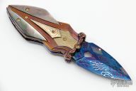 This knife by Suchat Jangtanong features a blued Mosaic Damascus blade with a brass pin for opening. The handle has blued Damascus bolsters, scales consisting of anodized and carved titanium, black lip pearl and mokume, anodized and fileworked titanium liners, fileworked and anodized titanium backspacer. Nice detent, lockup and blade seating. Excellent condition.