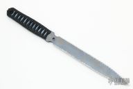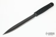 This Dagger by Marko Zagar features an orange peel finished and anodized titanium chisel ground blade with carbidized edge and carbon fiber laminate on one side, .245" blade stock and .934" blade depth, full tang construction. The handle has a black ito wrap. Excellent condition.