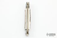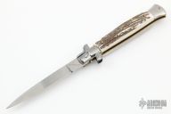 This Bolster Release Swivel Bolster Auto features a tumble polished blade. The handle has stainless steel bolsters and butt, stag scales and brass liners. This knife fires by pulling down on the bolster, that is also how the knife is closed. Has a few light scratches, otherwise excellent condition. Comes with a zippered case. "UD96A000103 PATENT" on the blade.