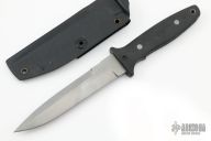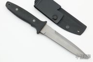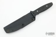 This Model 30 Battle Guard by Bob Terzuola features a bead blasted spear point blade with a sharpened top edge and notched thumbrest, .188" blade stock and 1.117" blade depth, hidden tang construction. The handle is black linen micarta with non-slip grip on the bottom of the handle and a lanyard hole. Comes with kydex sheath and original box and COA. Excellent condition.
