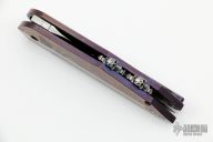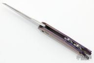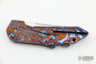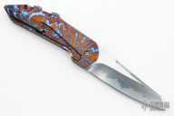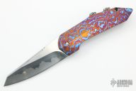 This Stampede SLT by GTC knives features a GTC 20CV core San Mai Damascus blade with flipper. The handle has a GTC 3-Alloy Mokuti frame, sterling silver Steel Flame backspacer with two skulls, matching tip up clip with hidden screws. Nice action, detent, lockup and blade seating. Dated 2022. Rides on bearings, nice detent, lockup and blade seatin. New condition. Comes with a zippered case and COA.