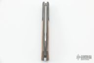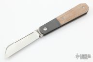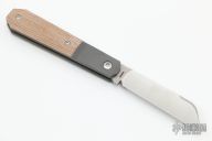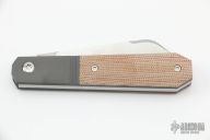 This Midnight Jack is a Barlow (Coffin) slipjoint model by Jack Wolf Knives featuring a satin finished sheepsfoot blade with longpull. The handle has integral bead blast finish pinched and fluted titanium front and rear bolsters and liners, micarta scales with a stainless spring. Comes with box, metallic tube with Sean Tiffany artwork, leather slip, sticker and microfiber cleaning cloth. New from Maker.