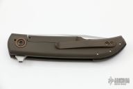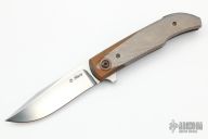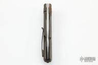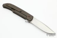 This Framehorn Flipper by David Sharp features a hand rub satin finished blade with a notched flipper. The handle has a super conductor and bead blasted and anodized titanium frame with a textured copper pivot collar and a lightning strike carbon fiber backspacer, anodized titanium tip up clip. Nice detent, lockup and blade seating. Excellent Condition.