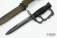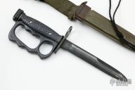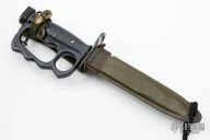 This is the M7 bayonet for the M16 rifle. This one has an added knuckle guard. Pretty cool. Includes a M8A1 sheath. Has somes sheath marks, and general wear, otherwise good condition.