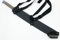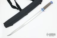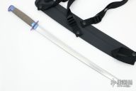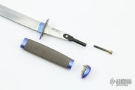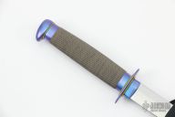 This Rare Takedown Wakizashi by Tom Maringer features a hand rub satin finished blade, .227" blade stock and .909" blade depth, hidden takedown tang construction. The handle has anodized titanium fittings with a wire wrapped grip. Comes with a kydex sheath with shoulder rig. Excellent condition. Comes with a sword bag. #932 and dated 2009 on tang.