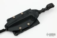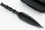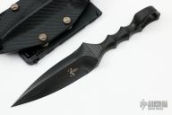 The Marfione Custom Knives M.D.T. fixed blade is a specialty built tactical dispatch tool that's piercing its way into the civilian world. This knife is made from solid CPM-3V stainless steel with a DLC Double Vapor Blast finish. Its blade design resembles a beak with deep hollow grinds and a recessed underside for effortless penetration. A grooved handle with a 1" finger hole and notches and checkering for added thumb traction provides absolute grip security, and a surprising level of comfort in the hand. The M.D.T. includes a custom fitted Kydex sheath for secure carry and storage. Comes with original box and metal COA. Excellent condition.