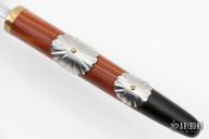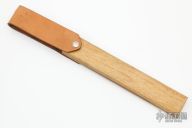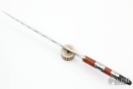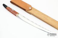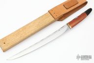 This Long Tanto (please let us know if you recognize this maker) features a mirror polished blade with fileworked spine, .285" blade stock and 1.131" blade depth, hidden tang construction. The handle has a brass guard, two-piece wood grip with textured metal overlays on the spine of the handle. There is a small crack in the handle from the guard to the butt, otherwise excellent condition. Comes with a wood and leather scabbard.