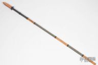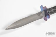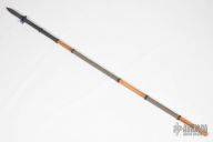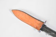 This Boar Spear by Van R Steck features a hand rub satin finished double edged blade with visible temper line right at the ricasso, .245" blade stock and 1.531" blade depth, hidden tang construction. Has a flower shaped anodized titanium guard, octogonal wood pole with carbon fiber and epoxied paracord wrapped grips. Comes with a hand tooled brown leather sheath for the blade. Excellent condition. Pretty cool piece to have leaning in the corner!