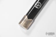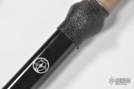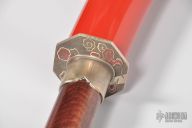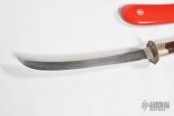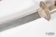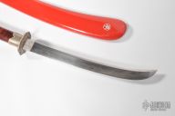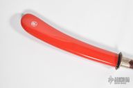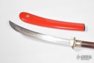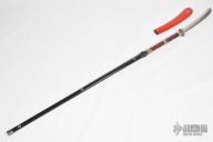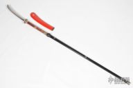 This Japanese Pole Sword by Scott Slobodian features a hand rub satin finished blade with beautiful hamon, .314" blade stock and 1.426" blade depth, hidden tang construction. The handle has a fine silver habiki, tsuba with engraving, stained wood and black laquered wood pole with nickel silver and epoxied cord wrapped fittings. Comes with a red  lacquered wood scabbard. Excellent condition. Stunning peice to have leaning up in the corner of your office!