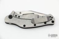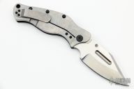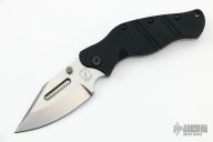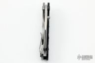 This knife has a satin finished blade with fullers and single thumbstud. The handle has black G-10 scales, tumbled titanium frame and tip up clip. Has stainless lockface insert with integral over travel stop. Comes with original packaging. New from maker.