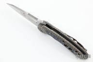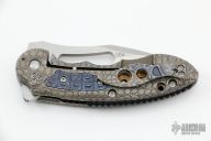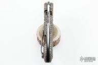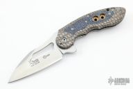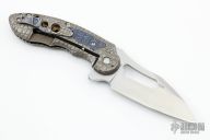 This Framelock Flipper by Flavio Ikoma features a hand rub satin finished blade with notched thumbrest and flipper. The handle has a carved titanium frame with anodized and carved titanium inlays, matching tip up clip with carving, black G-10 backspace with filework. Frame has been milled from the inside to reduce the weight, inside of frame has also been jeweled. Rides on IKBS, nice detent, lockup and blade seating. #004 on the blade. Comes with a zippered case. Excellent condition.