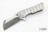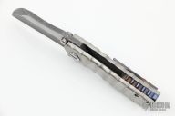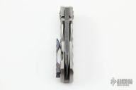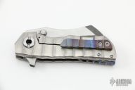 This Toucan by DaracSteel features a two-tone wharncliffe blade with dual thumbstuds and a checkered flipper. The handle has an orange peel finished titanium frame with anodized titanium backspacer and a tip up pocket clip. Rides on bearings, nice detent, lockup and blade seating. Excellent condition.