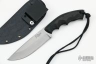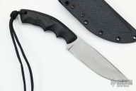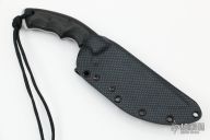 This Humpback by Jeff Diotte features a bead blasted blade with notched thumbrest, .208" blade stock, 1.322" blade depth, full tang construction. The handle has carbon fiber and black G-10 laminated scales. Comes with a kydex sheath. Excellent condition.