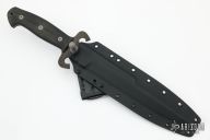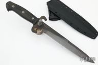 This custom Crossada was designed by Master at Arms James Keating and made by Robert Newton, it has a double edged bayonet ground blade, nice hamon, .244" blade stock and 1.441" blade depth, full tang construction with black canvas micarta scales. Comes with a kydex sheath and quillions. Excellent condition.