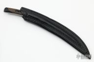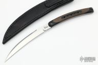 This Custom Talon by Todd Begg features a hand rub satin finished blade with false top edge, notched thumbrest and finger rest, .163" blade stock and 702 blade depth, full tang construction. The handle has black G-10 scales with green canvas micarta inlays, has a jewel ice finished tang. Comes with hand tooled black leather sheath by AC Warren. Excellent condition.