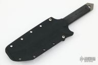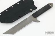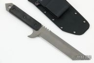 This tanto by "MT" (please let us know if you know who this is) features a bead blasted tanto blade with false top edge and notched thumbrest, 193" blade stock and 1.226" blade depth, full tang construction with black G-10 scales. Comes with a kydex sheath. Has a few light scuffs, otherwise excellent condition.