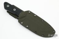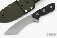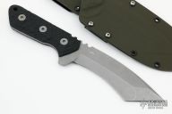 This Tanto by Eric Elson has a tumble finished blade and sculpted black G10 scales, .167" blade stock and 1.798" blade depth. Notched thumbrest. Comes with a kydex sheath. Excellent condition.