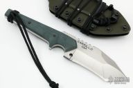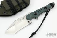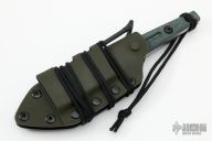 This M1 Scout From Dwaine Carrillo features a satin finished blade with .250" thick stock and 1.785" blade depth, full tang construction. Notched thumbrest and ringer rests. Green G-10 scales.The one handed quick release sheath is open at the bottom, with spacers, to prevent the retention of mud, water, sand etc. Excellent condition.