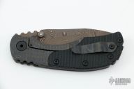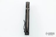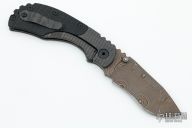 This RC framelock by Mick Strider features a nightmare grind recurve Damascus blade with notched thumbrest and dual thumbstuds. The handle has a titanium frame with black G-10 scales, flamed titanium backspacer and tip up titanium clip. Nice detent, lockup and blade seating. Comes with a Velcro pouch. Has a couple light scratches on the clip and backspacer, otherwise excellent condition.