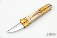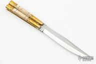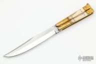 This balisong from the Philippines features a drop point blade with a satin polished blade. The handle has brass bolsters, brass channel/liners, bone scales, brass T-latch. Excellent condition.