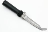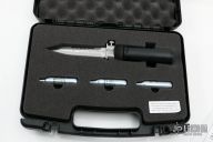 This Wasp scuba knife features a clip point blade with serrated spine, 1/4" blade stock and 1" blade depth, hidden tang construction. The blade has a gas injection system. The handle has a titanium guard with push button for CO2 release, and removable rubber handle where the CO2 cartridge is installed. Comes with original box, and papers. Excellent condition.