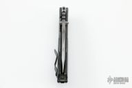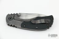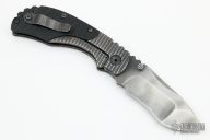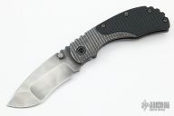 This RC framelock by Mick Strider features a bead blast finish nightmare grind recurve blade with notched thumbrest and dual thumbstuds. The handle has a titanium frame with black G-10 scales, flamed titanium backspacer and tip up titanium clip. Comes with a zipper case. Blade favors the right side, has vertical and horizontal blade play. Has chips in the blade, light scratches and scuffs throughout. Fair condition. Blade finish appears modified.