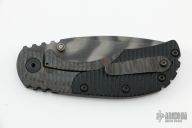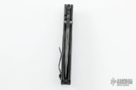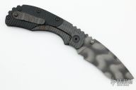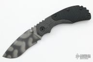This RC framelock by Mick Strider features a bead blast finish nightmare grind recurve blade with notched thumbrest and dual thumbstuds. The handle has a titanium frame with black G-10 scales, flamed titanium backspacer and tip up titanium clip. Comes with a zipper case. Has nice detent. Blade has a little wobble. Scuffs and scratches throughout, good user condition.