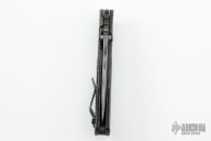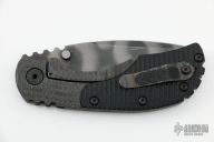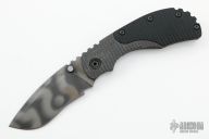 This RC framelock by Mick Strider features a bead blast finish nightmare grind recurve blade with notched thumbrest and dual thumbstuds. The handle has a titanium frame with black G-10 scales, flamed titanium backspacer and tip up titanium clip. Comes with a zipper case. Has nice detent, action, and blade seating. Scuffs and scratches throughout, good user condition. Comes with a kydex sheath.