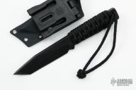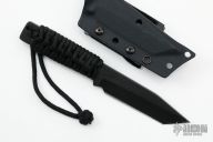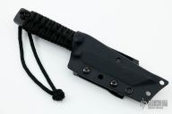 This knife by Mick Strider features a black blade with notched thumbrest, paracord wrap, .246" blade stock and 1.070" blade depth, full tang construction with cord wrapped handle. Comes with kydex sheath. Has some scuffs, good condition otherwise.