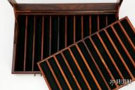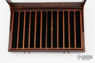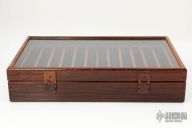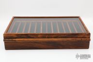 This model has two-levels, a glass top, and a total of 24 slots. The slots measure 7.25" x .875" x .5". Exterior dimensions are 14.5" x 9.5" x 3.125". When you own custom pens made by the world's master craftsmen, you deserve something of equal quality in which to display them. All Tomway chests and boxes are made of exotic cocobolo rosewood. As unique as nature itself, cocobolo rosewood ranges from a rich dark brick red to reddish or dark brown, with a figuring of darker irregular traces weaving through the wood. This is a wood so dense (70 lbs. per sq. foot) and rich that it provides not only a quality setting for your collectibles, it also offers substantial protection. All chests and boxes are padded and upholstered with a premium acid free micro-suede. Excellent condition. Could also hold most slipjoint as well.