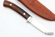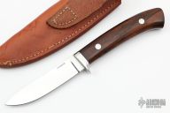 This fixed blade knife from George Herron features a mirror polished guard and blade. .120" Blade Stock .794" Blade Depth. A tapered tang construction with a wood scales. Nice lightweight hunter. Very comfortable.  The sheath is numbered 026.  The tang is numbered 2145 but fits the sheath nicely.  Includes a brown leather sheath.  Excellent Condition.
