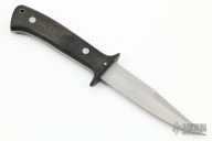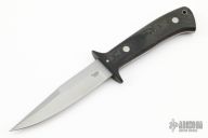 This chute knife by GenO Denning features a bead blasted blade, .129" stock and .893" blade depth, full tapered tang construction.  The handle has a micarta guard, micarta scales with red liners/spacers, lanyard hole. Comes with a black leather sheath.  S/N 0125. Excellent condition.