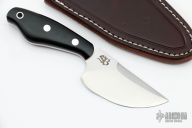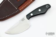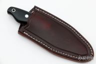 This  features a satin finished blade with .156" blade stock and 1.43" blade depth, full tang construction. The handle has black canvas micarta scales, red liners and lanyard hole. Comes with brown leather sheath and original box. Has a couple light scuffs otherwise excellent condition.
