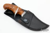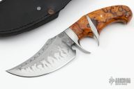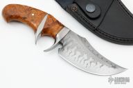 This Sub-Hilt Skinner by Jan Hafinec is beautiful. It features an upswept blade (C105 Carbon Steel) with amazing hamon and sharpened top edge, .205" blade stock and 1.850" blade depth, hidden tang construction. The handle has bead blasted stainless steel guard and sub-hilt with an ironwood burl grip, and a stainless steel pin. Comes with a black leather sheath. New from maker.
