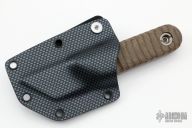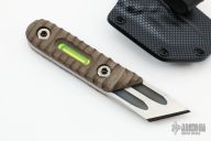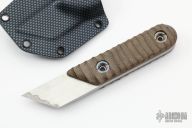This "Bone Chisel" kiridashi by Eric Blair features a hand rub satin finished chisel ground titanium blade with carbide edge and fullers, .210" blade stock and 1.038" blade depth, full tang construction. The handle has sculpted green canvas micarta scales with tritium insert. Comes with kydex sheath. Excellent condition.
