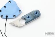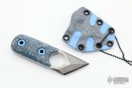 This "Bone Chisel" kiridashi by Eric Blair features a hand rub satin finished chisel ground titanium blade with carbide edge and finger hole, .223" blade stock and 1.273" blade depth, full tang construction. The handle has sculpted blue giraffe bone scales with anodized titanium hardware. Comes with kydex neck sheath. Excellent condition.