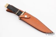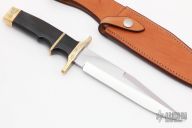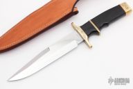 This sub-hilt fighter by Harold Corby features a mirror polished blade with sharpened top edge, .181" blade stock and 1.323" depth, hidden tang construction. The handle has an engraved brass guard, sub-hilt and butt, buffalo horn grip with red spacers. Comes with a brown leather sheath. Excellent condition.