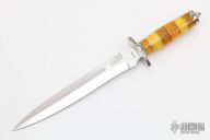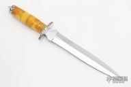 This beautiful dagger by Harold Corby features a mirror polished blade with .231" blade stock and 1.477" blade depth, hidden tang construction. The handle has engraved nickel silver guard and butt, stacked amber grip with nickel silver spacers. This is a stunning example of Corby's outstanding craftsmanship. Comes with padded zippered case. Excellent condition.