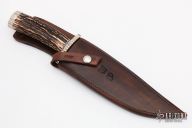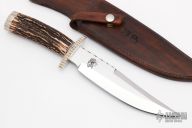 This Fighting Bowie by Harold Corby features a mirror polished blade with a sharpened top edge and fileworked spine, .241" blade stock and 1.594" depth, hidden tang construction. The handle has a nickel silver guard and butt, stag grip with red/white/black spacers. Comes with a brown leather sheath and zippered case. Excellent condition.