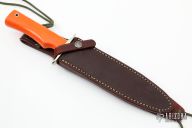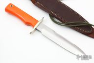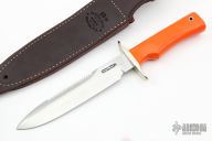 This Model 16 Special Fighter from Randall Made Knives features a satin finish spear point blade with sawteeth and sharpened top edge, .184" blade stock and 1.200" blade depth, full tang construction. The handle is comprised of a nickel silver guard and orange G-10 grip. Aluminum lanyard tube with lanyard in pommel. Includes a waxed brown leather sheath with belt loop. Excellent condition.