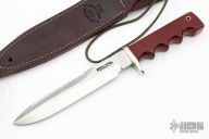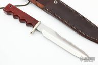 This Model 16 Diver from Randall Made Knives features a satin finish spear point blade with sawteeth and sharpened top edge, notched thumbrest, .220" blade stock and 1.197" blade depth, full tang construction. The handle is comprised of a nickel silver guard and red linen micarta grip. Aluminum lanyard tube with lanyard in pommel. Includes a waxed brown leather sheath with belt loop. Excellent condition.