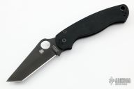 This G81GM4BKP2 Paramilitary 2 by Spyderco features a black tanto blade with thumb hole, notched thumb ramp and choil. The handle is comprised of textured black G10 scales over a stainless steel subframe and lockbar. 4 way adjustable pocket clip and lanyard tube in pommel. Includes original box and paperwork. Excellent condition.