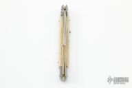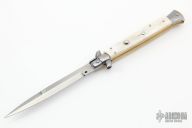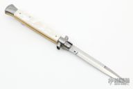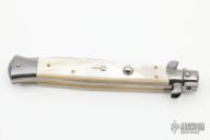 This 11" Picklock by Frank Beltrame features a polished bayonet ground blade with false top edge. The handle has stainless steel bolsters, front and rear, mother of pearl scales, brass liners, stainless spring. Excellent condition.