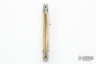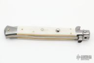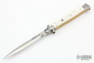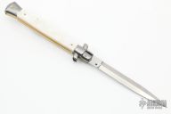 This 11" Picklock by Frank Beltrame features a polished dagger ground blade with false top edge. The handle has stainless steel bolsters, front and rear, mother of pearl scales, brass liners, stainless spring. Excellent condition.