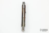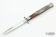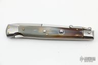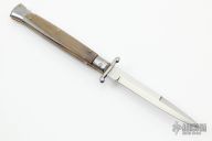 This 11" Swing Guard Auto by Frank Beltrame features a polished bayonet ground blade with false top edge. The handle has stainless steel bolsters, front and rear, honey horn scales, brass liners, stainless spring. Excellent Condition.