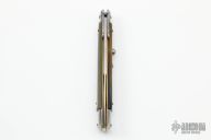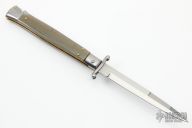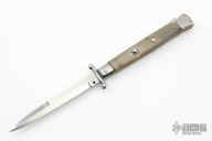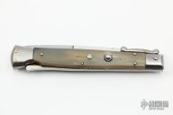 This 11" Swing Guard Auto by Frank Beltrame features a polished bayonet ground blade with false top edge. The handle has stainless steel bolsters, front and rear, honey horn scales, brass liners, stainless spring. Excellent Condition.