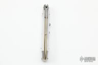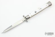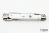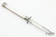This 11" Swing Guard Auto by Frank Beltrame features a polished bayonet ground blade with false top edge. The handle has stainless steel bolsters, front and rear, pearlex scales, brass liners, stainless spring. Excellent Condition.